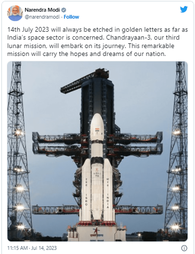ચંદ્રયાન-3ના લોન્ચિંગ પહેલા પીએમ મોદીએ મિશનની શુભેચ્છા પાઠવી હતી. ભારતના અવકાશ ક્ષેત્રમાં 14 જુલાઈ 2023ની તારીખ હંમેશા સુવર્ણ અક્ષરોમાં અંકિત રહેશે. અમારું ત્રીજું ચંદ્ર મિશન ચંદ્રયાન-3 તેની યાત્રાએ રવાના થશે. આ મિશન આપણા રાષ્ટ્રની આશાઓ અને સપનાઓને આગળ વધારશે. ચંદ્રયાન-3 મિશન માટે શુભેચ્છાઓ!