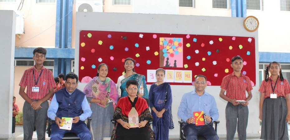જે અંતર્ગત ધોરણ 6 ની વિદ્યાર્થીની દુર્ગા આહિરે ગુરુપૂર્ણિમાનું મહત્વ સમજાવ્યું હતું, ધોરણ 4 અને 5 ના વિદ્યાર્થીઓ દ્વારા સંસ્કૃત ભાષામાં ગુરુસ્તુતિ ભાવાર્થ સાથે રજુ કરવામાં આવી હતી, ધોરણ 1ના નાના ભૂલકાઓ દ્વારા સુંદર મજાનું અભિનય ગીત રજુ કરવામાં આવ્યું હતું. સંગીત શિક્ષકના માર્ગદર્શન હેઠળ ધોરણ 6 થી 8 ના વિદ્યાર્થીઓ દ્વારા સંગીતમય શૈલીમાં ગુરુ મહિમાનું ગાન કરવામાં આવ્યું હતું, જીવનમાં ગુરુના સ્થાનનું મહાત્મ્ય સમજાવતું નાટક ધોરણ 5ના વિદ્યાર્થીઓ દ્વારા રજુ કરવામાં આવ્યું હતું, આ ઉપરાંત બધા જ ગુરુજનોને સમર્પિત એવી ગુરુવંદના ધોરણ 7 ની વિદ્યાર્થીનીઓએ રજુ કરી હતી. ધોરણ 9 અને 10ના વિદ્યાર્થીઓ દ્વારા શાળાના આચાર્ય શ્રી અને ઉપાચાર્ય શ્રી તથા પધારેલા અતિથિ વિશેષ ડૉ. હિનાબેન જાની સહિત સમગ્ર શિક્ષકોનું ગુરુપૂજન કરવામાં આવ્યું હતું.