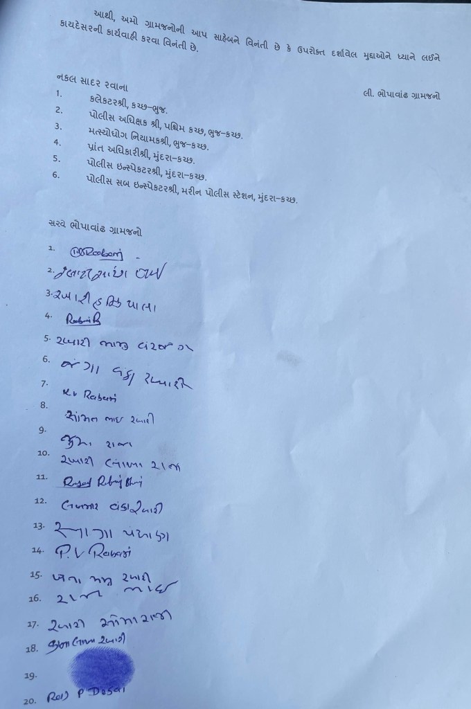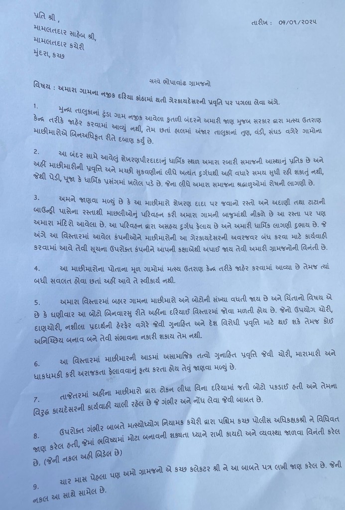 મુંદરા: મુંદરા તાલુકાના ભોપાવાંઢ નજીક આવેલ કુતડી બંદર પર અનઅધિકૃત રીતે દબાણ કરીને બેઠેલા બહારના માછીમારો અને બોટોની વધતી સંખ્યા ગામ માટે ચિંતાનો વિષય બન્યો છે તેમજ દરિયામાં મૂકાતી માણસ વગરની બોટોનો ચોરી, દાણચોરી, નશીલા પદાર્થની હેરફેર જેવી રાષ્ટ્રવિરોધી પ્રવૃત્તિ થઈ શકે કે કોઈ મોટો બનાવ બને, માછીમારીની આડમાં થતી અસામાજિક પ્રવૃત્તિ, આ બંદરની સામે આવેલું શેખરણપીરદાદા નું ધાર્મિક સ્થળ જે રબારી સમાજની આસ્થા નું પ્રતિક છે અને અહીં માછીમારી પ્રવૃત્તિ અને મછી સુકવણી થી વધારે સમય સુધી રહી શકાતું નથી અને પેડી, પૂજા અને ધાર્મિક પ્રસંગોમાં ખલેલ પડે છે જેથી શ્રદ્ધાળુઓમાં રોષ ની લાગણી છે વગેરે જેવી ગામની વિવિધ સમસ્યાઓને લઈને ભોપાવાંઢ ના ગ્રામજનો દ્વારા આજરોજ મુંદરા મામલતદાર શ્રી ને આવેદનપત્ર આપવામાં આવ્યું હતું અને આ બાબતે યોગ્ય પગલાં લેવા રજૂઆત કરવામાં આવી હતી.