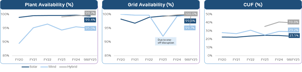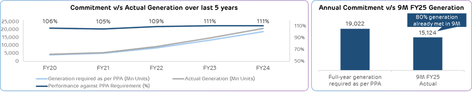 - Exceeding Commitments: AGEL has consistently generated electricity exceeding the overall annual commitment under the power purchase agreements. In FY24, AGEL’s PPA based electricity generation was 111% of the annual commitment. In 9M FY25, AGEL has already generated 80% of the annual commitment.