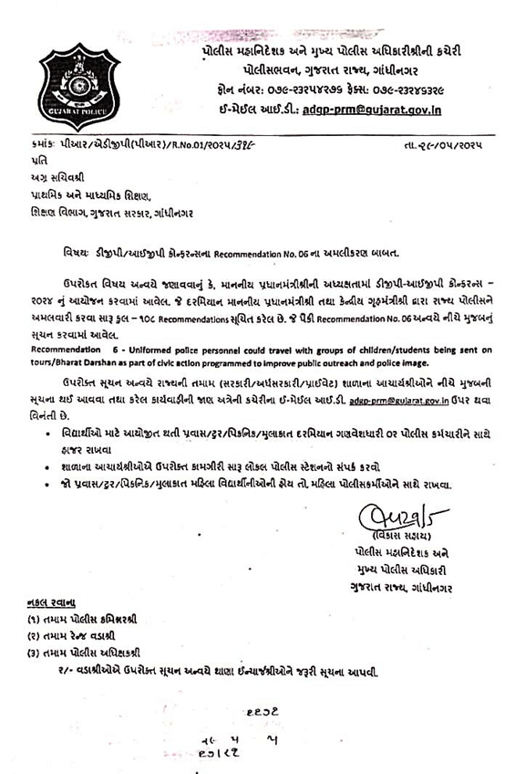 જેમાં ઉલ્લેખ કર્યો છે કે હવે વિદ્યાર્થીઓ માટે આયોજિત થતી પ્રવાસ/ટુર/પિકનિક/મુલાકાત દરમિયાન ગણવેશધારી 02 પોલીસ કર્મચારીને સાથે હાજર રાખવાનું કહેવાયું છે. આ સિવાય સ્કૂલના આચાર્યે પણ ઉપરોક્ત કામગીરી માટે સ્થાનિક પોલીસ સ્ટેશનનો સંપર્ક કરવો પડશે. જો પ્રવાસ/ટુર/પિકનિક/મુલાકાતમાં વિદ્યાર્થિનીઓ હશે તો મહિલા પોલીસકર્મી પણ સાથે રાખવા પડશે.