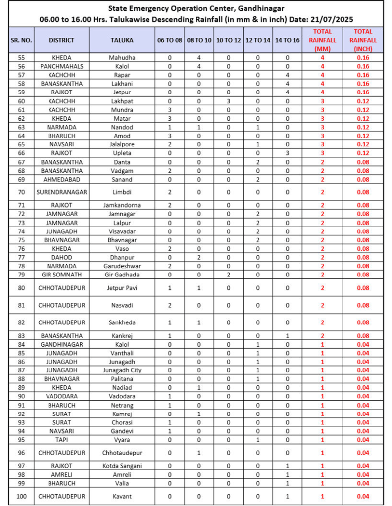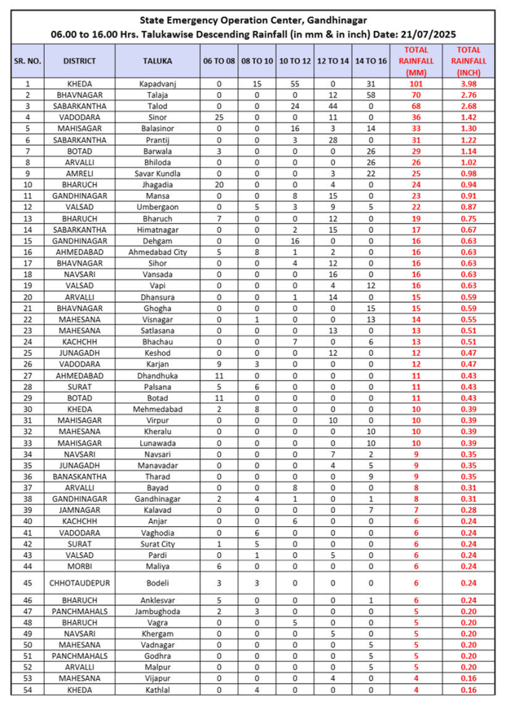 રાજ્યમાં આજે (21 જુલાઈ) સવારે 6 વાગ્યાથી સાંજે 4 વાગ્યા સુધીમાં 100 તાલુકામાં વરસાદ નોંધાયો છે. જેમાં ભાવનગર તળાજામાં 2.76 ઇંચ, સાબરકાંઠાના, તલોદમાં 2.68 ઇંચ, વડોદરાના સિનોરમાં 1.42 ઇંચ, મહીસાગરના બોલાસિનોરમાં 1.30 ઇંચ, સાબરકાંઠાના પ્રાંતિજમાં 1.22 ઇંચ, બોટાદના બરવાળામાં 1.14 ઇંચ, અરવલ્લીના ભિલોડામાં 1 ઇંચ વરસાદ ખાબક્યો છે.