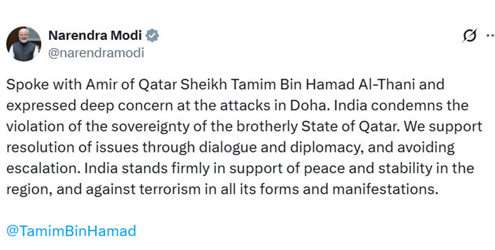 વડાપ્રધાન મોદીએ ટ્વિટર પર પોસ્ટ કરી હતી કે, ‘કતારના અમીર શેખ તમિમ બિન હમાદ અલ-થાની સાથે વાત કરી દોહામાં થયેલા હુમલાઓ પર ઊંડી ચિંતા વ્યક્ત કરી. ભારત કતારના સાર્વભૌમત્વના ઉલ્લંઘનની નિંદા કરે છે. ભારતના સુસંગત વલણનું પુનરાવર્તિત કરતા અમે સંવાદ અને રાજદ્વારી દ્વારા વિવાદોનો ઉકેલ લાવવા હાંકલ કરીએ છીએ. વિવાદોને વધતા અટકાવવાની જરૂરિયાત પર ભાર મૂક્યો. તેમણે કહ્યું કે, અમે વાતચીત અને કૂટનીતિ મારફત મુદ્દાઓનું સમાધાન કરવા અને વધતો તણાવ અટકાવવાનું સમર્થન કરીએ છીએ. ભારત આ ક્ષેત્રમાં શાંતિ અને સ્થિરતા માટે તમામ રૂપ અને અભિવ્યક્તિઓમાં આતંકવાદ વિરૂદ્ધ દ્રઢતાથી ઉભા છીએ.