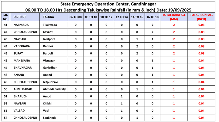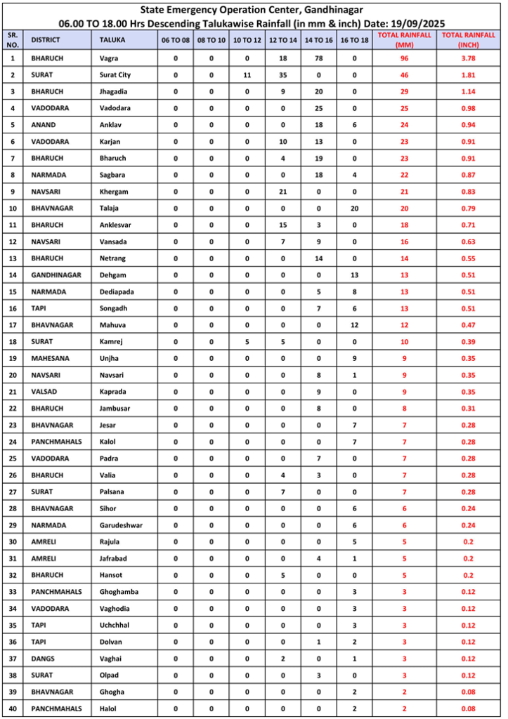 ગુજરાત સ્ટેટ ઇમરજન્સી ઓપરેશન સેન્ટરના આંકડા મુજબ, આજે શુક્રવારે (19 સપ્ટેમ્બર) સવારે 6 વાગ્યાથી સાંજે 6 વાગ્યા સુધીમાં 54 તાલુકામાં વરસાદ ખાબક્યો છે. જેમાં સૌથી વધુ ભરૂચના વાગરામાં 3.78 ઇંચ વરસાદ ખાબક્યો છે.