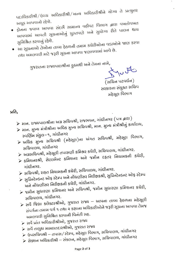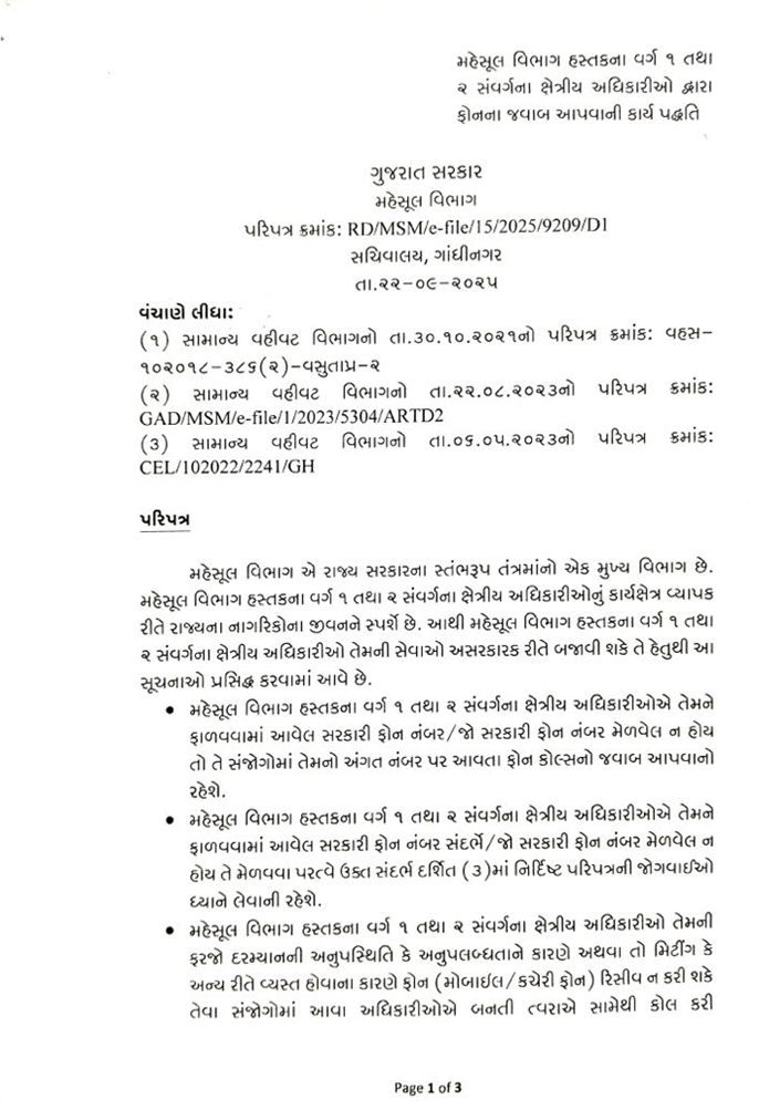 પરિપત્ર મુજબ મહેસૂલ વિભાગના વર્ગ-1 અને વર્ગ-2ના અધિકારીઓએ ચૂંટાયેલા નેતાઓ અને જનતાના ફોન ફરજિયાતપણે ઉપાડવા પડશે. જો કોઈ કારણસર ફોન ન ઉપાડી શકાય તો બાદમાં કોલબેક કરવો પણ ફરજિયાત છે. આ ઉપરાંત, ફોન પર વાતચીત કરતી વખતે સામાન્ય વહીવટ વિભાગ દ્વારા નિર્ધારિત કરાયેલી ગાઇડલાઇનનું પણ પાલન કરવું પડશે.