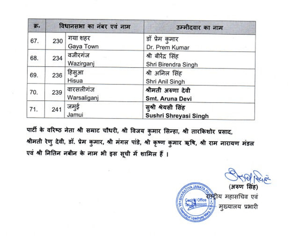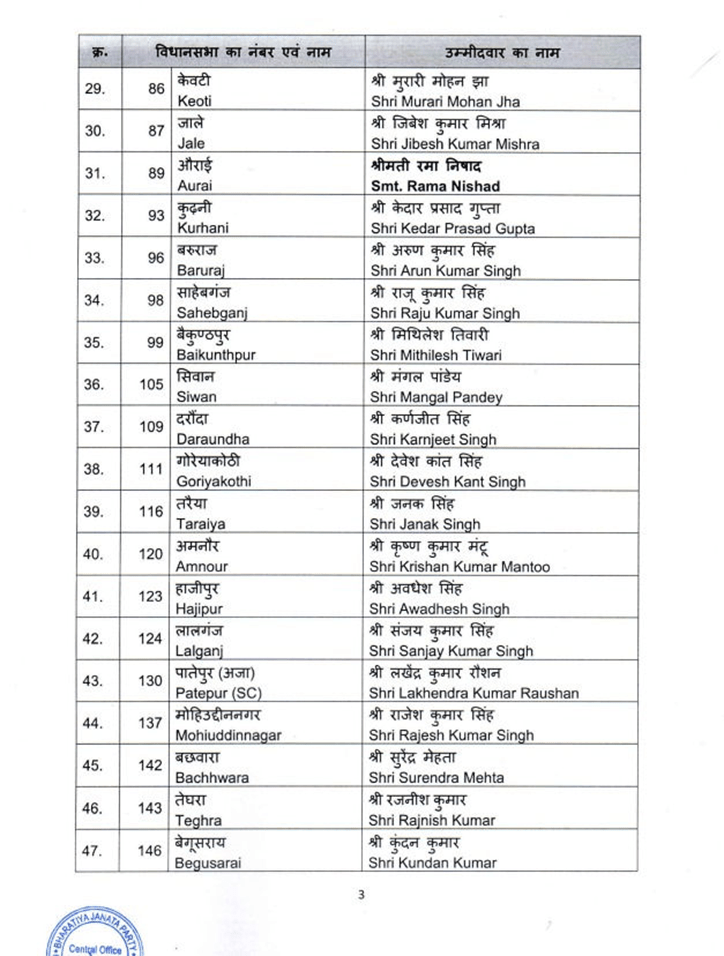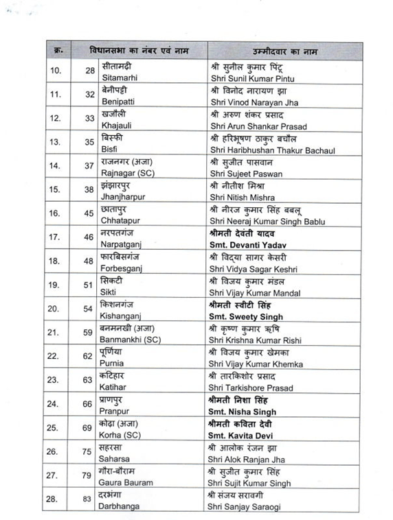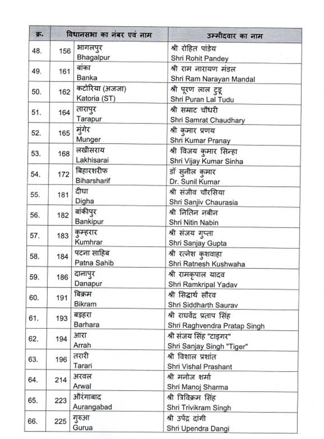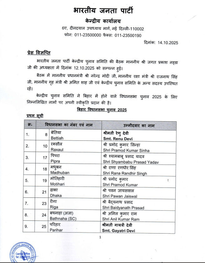 બિહારમાં ટૂંક સમયમાં ચૂંટણીનું આયોજન થવા જઈ રહ્યું છે. બિહાર વિધાનસભાની આગામી ચૂંટણીને ધ્યાનમાં રાખીને ભારતીય જનતા પાર્ટી(BJP)એ પોતાના ઉમેદવારોની પ્રથમ યાદી જાહેર કરી દીધી છે. પાર્ટી દ્વારા કુલ 71 વિધાનસભા બેઠકો પર ઉમેદવારોના નામનું એલાન કરવામાં આવ્યું છે, જે દર્શાવે છે કે ભાજપે પ્રથમ તબક્કાની બેઠકો પર ધ્યાન કેન્દ્રિત કર્યું છે. આ યાદીમાં અનેક વર્તમાન ધારાસભ્યોને રિપીટ કરાયા છે, જ્યારે કેટલાક નવા ચહેરાઓને પણ તક આપવામાં આવી છે.