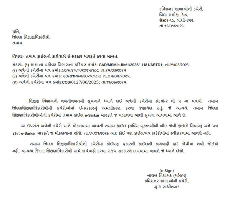 ઉલ્લેખનીય છે કે, પ્રાથમિક શિક્ષણ વિભાગમાં વર્ષ 2024થી ઇ સરકારમાં કામગીરી ચાલે છે અને નવો જે આદેશ છે એ સેકન્ડરી અને હાયર સેકન્ડરી શિક્ષણ માટે છે., પરંતુ કેટલીક કચેરીઓ હજુ પણ જૂની પદ્ધતિથી જ કામ કરતી હતી. તેથી આજ (15મી જાન્યુઆરી)થી આ સિસ્ટમનો કડક અમલ કરવા અને વહીવટી પ્રક્રિયાને વધુ સુગમ બનાવવા માટે આ અંતિમ આદેશ કરવામાં આવ્યો છે.