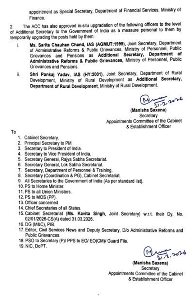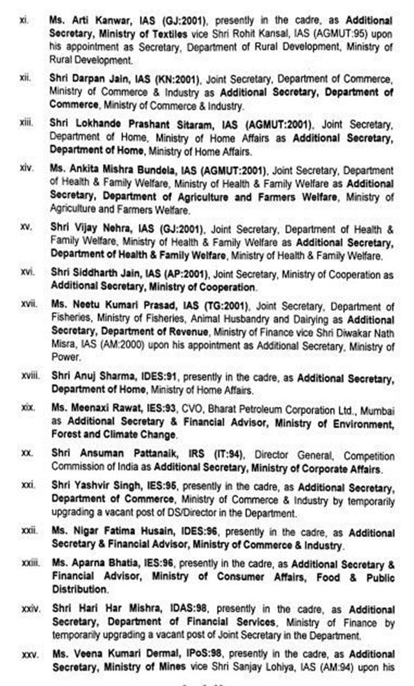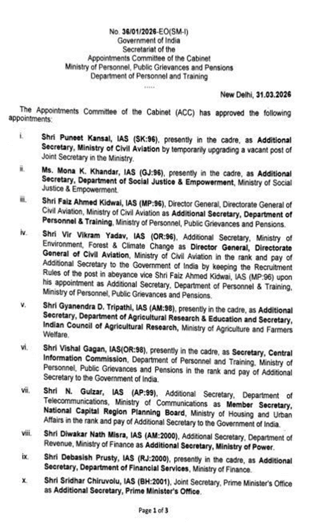 કેન્દ્ર સરકારની કેબિનેટ નિમણૂક સમિતિ (ACC) દ્વારા દેશભરના વરિષ્ઠ સનદી અધિકારીઓના સ્તરમાં મોટા ફેરફાર કરવામાં આવ્યા છે. આ અંતર્ગત ગુજરાત કેડરના ત્રણ IAS અધિકારીઓને ભારત સરકારના વિવિધ મંત્રાલયોમાં એડિશનલ સેક્રેટરી તરીકે પ્રમોશન આપી મહત્ત્વની જવાબદારીઓ સોંપવામાં આવી છે.